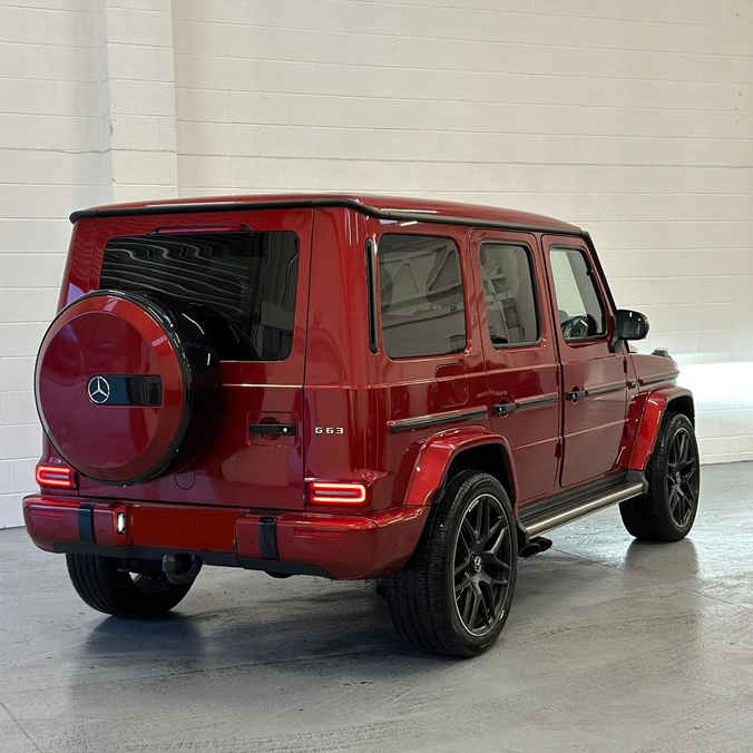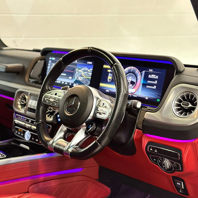 The AMG G63 sets itself apart from every other model and most cars with some very unique features and one of the most distinctive features of the G Wagon is its radiator trim which has an impressive louvres with the glossy chrome Mercedes logo in the centre. The G wagon also has very stylish light-alloy wheels with its striking and powerful design. 20 inch AMG 10-spoke light alloys that are finished with a high sheen finish.