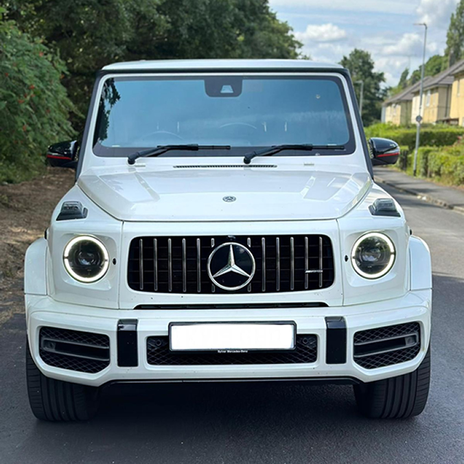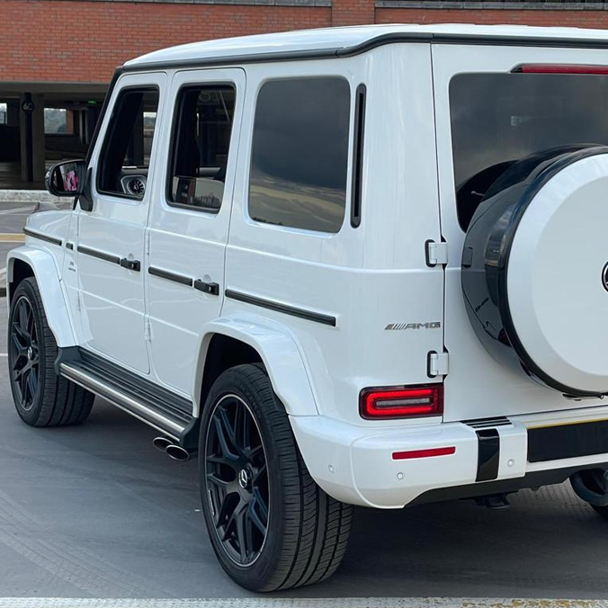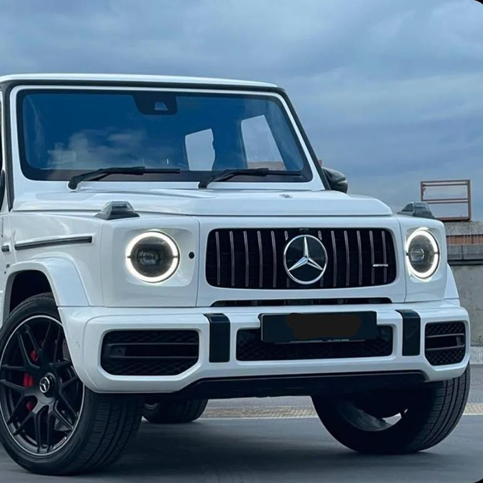 The Mercedes G63 AMG, often referred to as the G-Wagon, is a perfect fusion of rugged charm and high-end luxury. The first thing that grabs your attention is its brilliant white exterior, which perfectly accentuates the vehicle’s muscular, boxy design – a signature feature that the G-Wagon is known for. The upright stance, flared wheel arches, and the broad grille, emblazoned with the unmistakable three-pointed star, all contribute to its distinctive and formidable presence.
